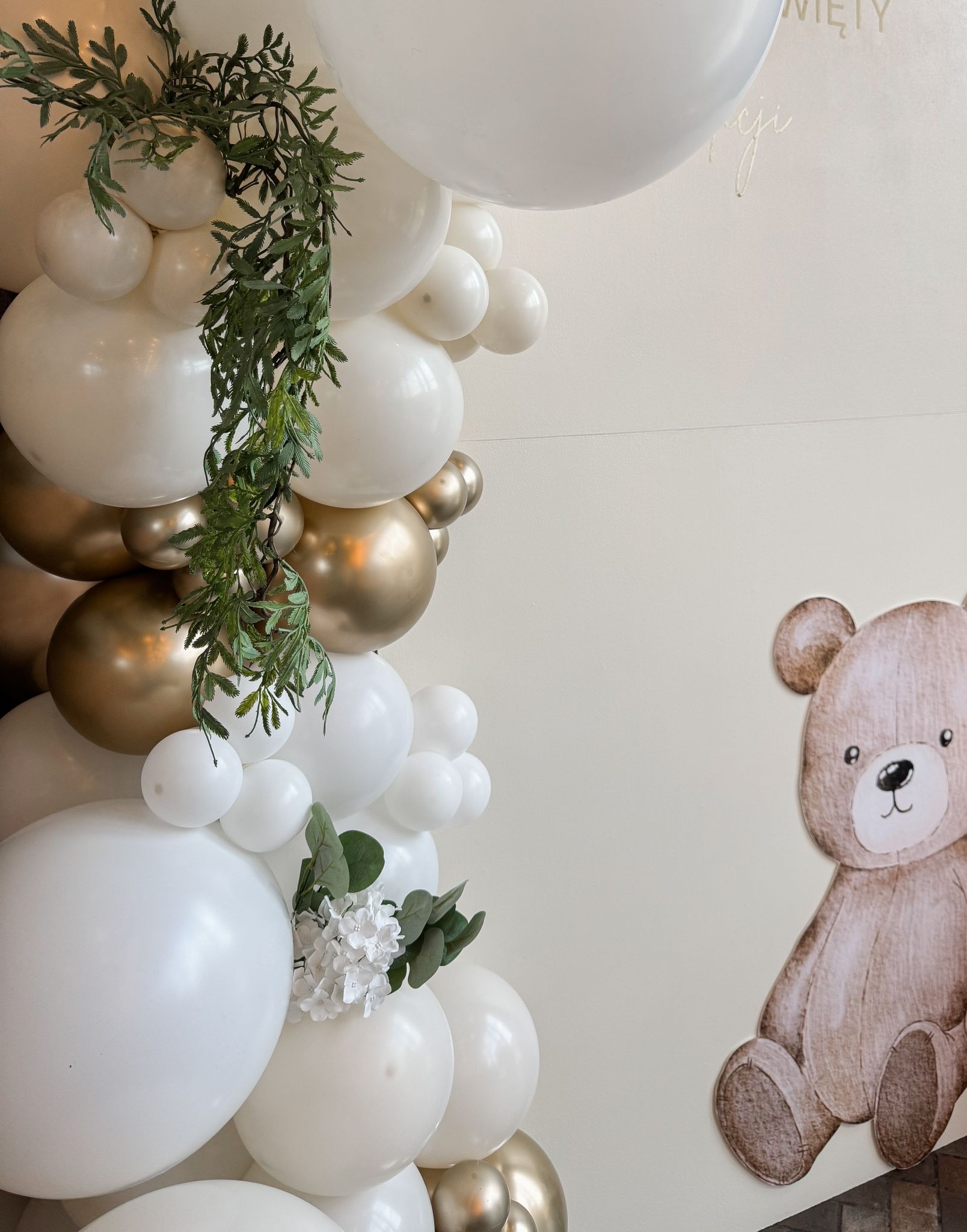 Nasza realizacja na Chrzest Święty Felicji w Restauracji Strefa Smaków Kłos w Zabrzu. Głównym elementem była ścianka modułowa typu łuki z grafiką misia i złotym napisem. Całość uzupełniły organiczne girlandy balonowe w palecie bieli, złota i beżu.
