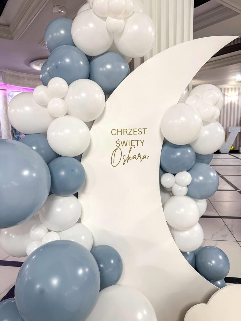 Z okazji Chrztu Świętego Oskara w Restauracji Racula w Paniówkach wykonaliśmy personalizowaną ściankę do zdjęć z motywem księżyca. Kompozycję dopełniła organiczna girlanda balonowa w odcieniach bieli i zgaszonego błękitu oraz dekoracyjny element w kształcie chmurki.