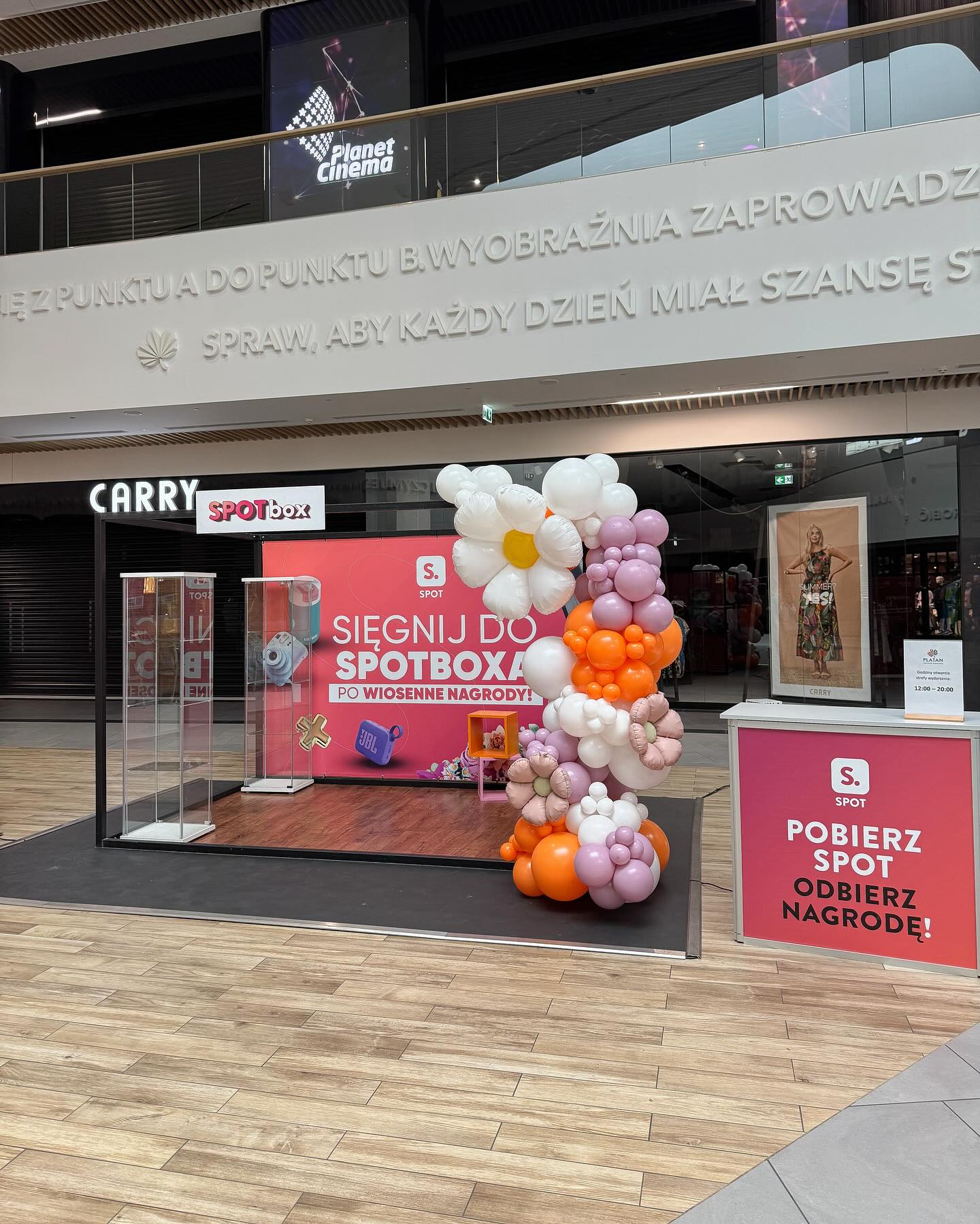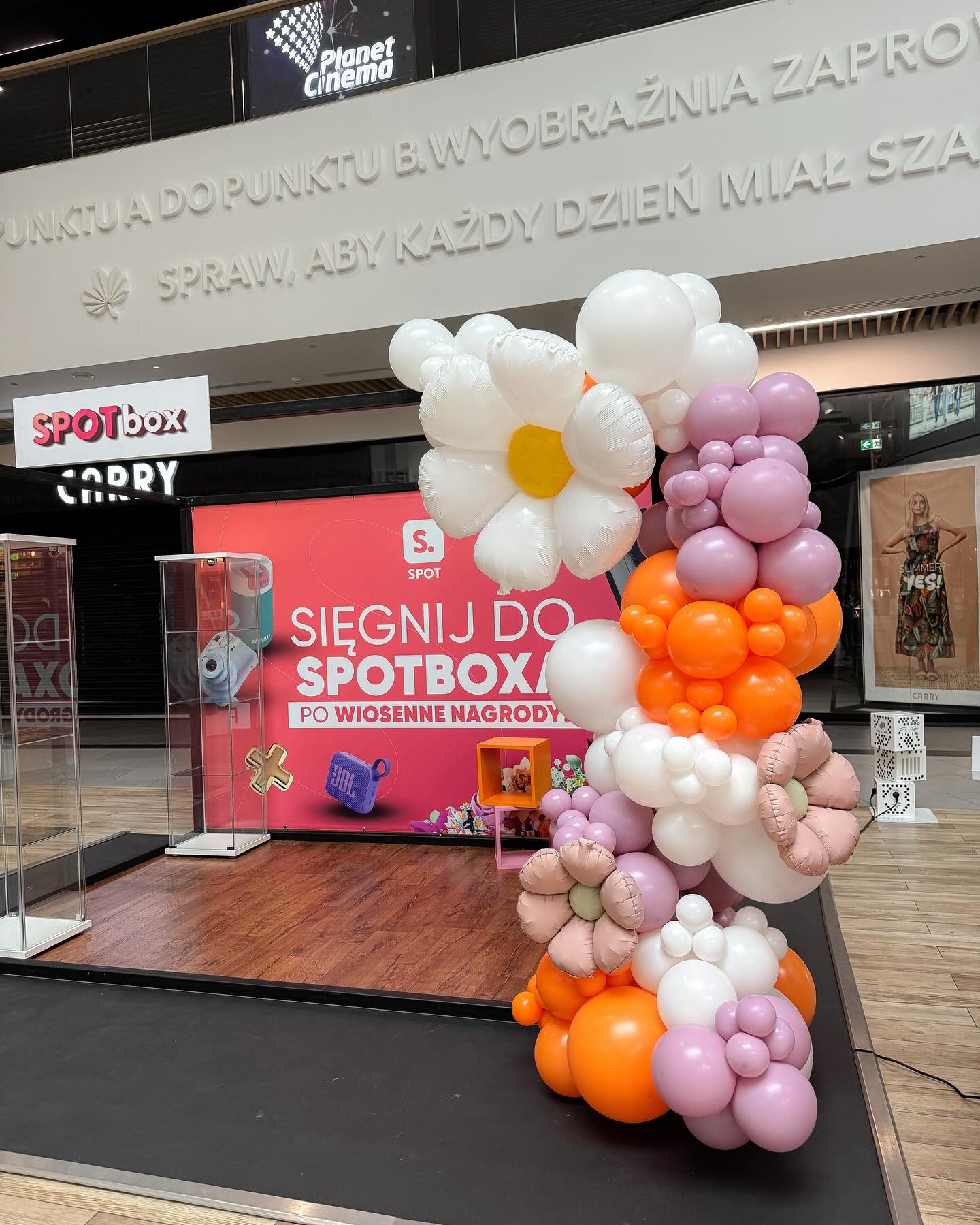 Kolorowa girlanda balonowa z kwiatami, wykonana na event promocyjny marki SPOT w centrum handlowym Platan w Zabrzu. Dekoracja przyciągała uwagę i służyła jako tło do zdjęć.