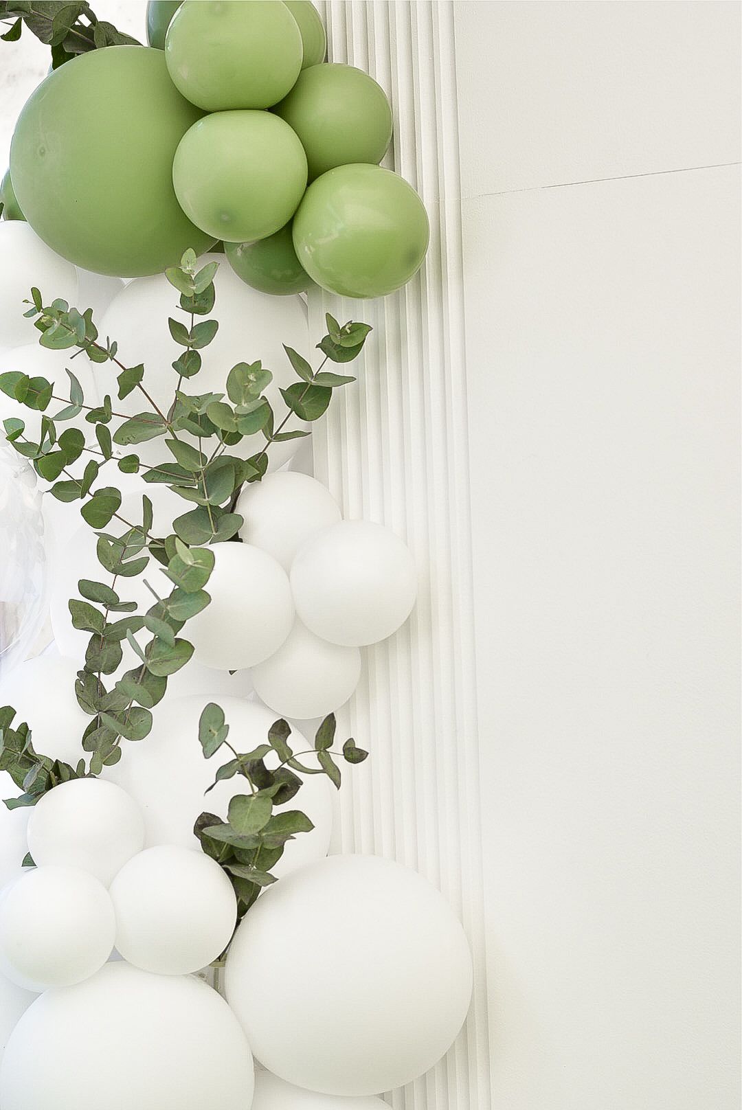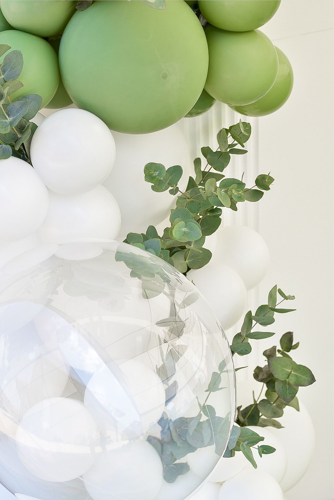 Dekoracja na poprawiny w ogrodzie w Zabrzu – biała ścianka z inicjałami, zielono-biała girlanda balonowa z dodatkiem eukaliptusa i transparentnych balony bubble. Elegancki, minimalistyczny styl idealny na garden party.