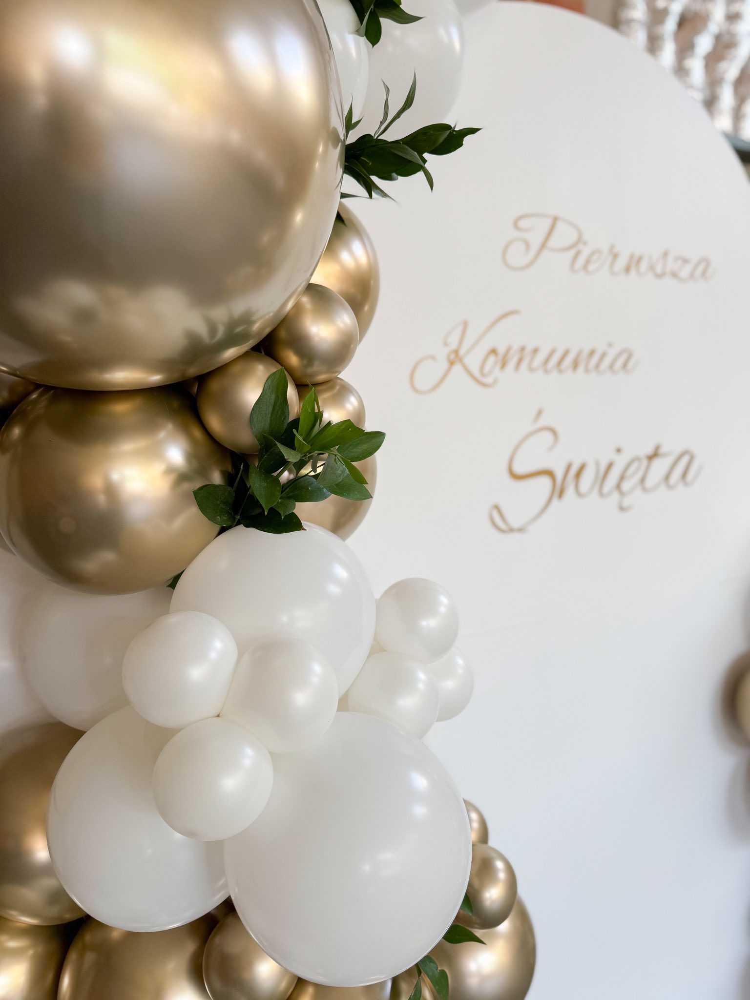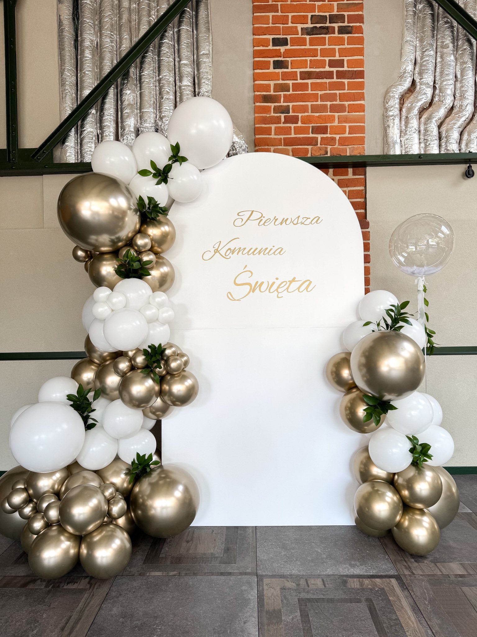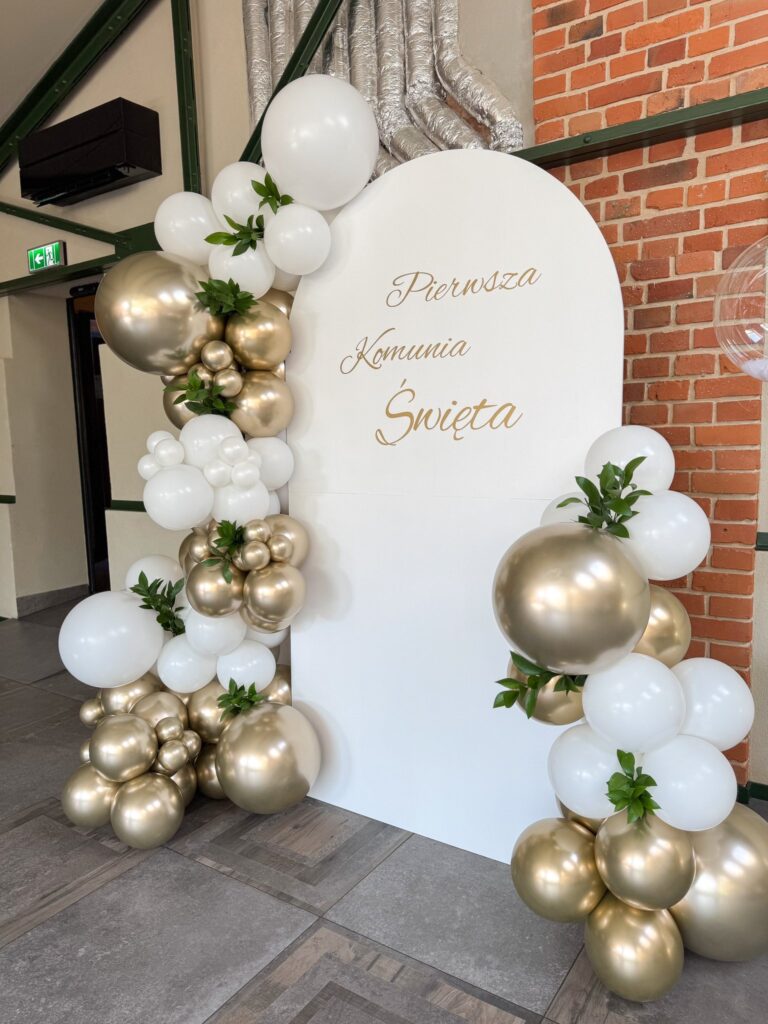 Dekoracja komunijna wykonana w Szybie Maciej w Zabrzu. Ścianka modułowa w kształcie łuku, złoto-białe balony, zielone akcenty i personalizowany napis. Jasna, klasyczna kompozycja – idealna do zdjęć.