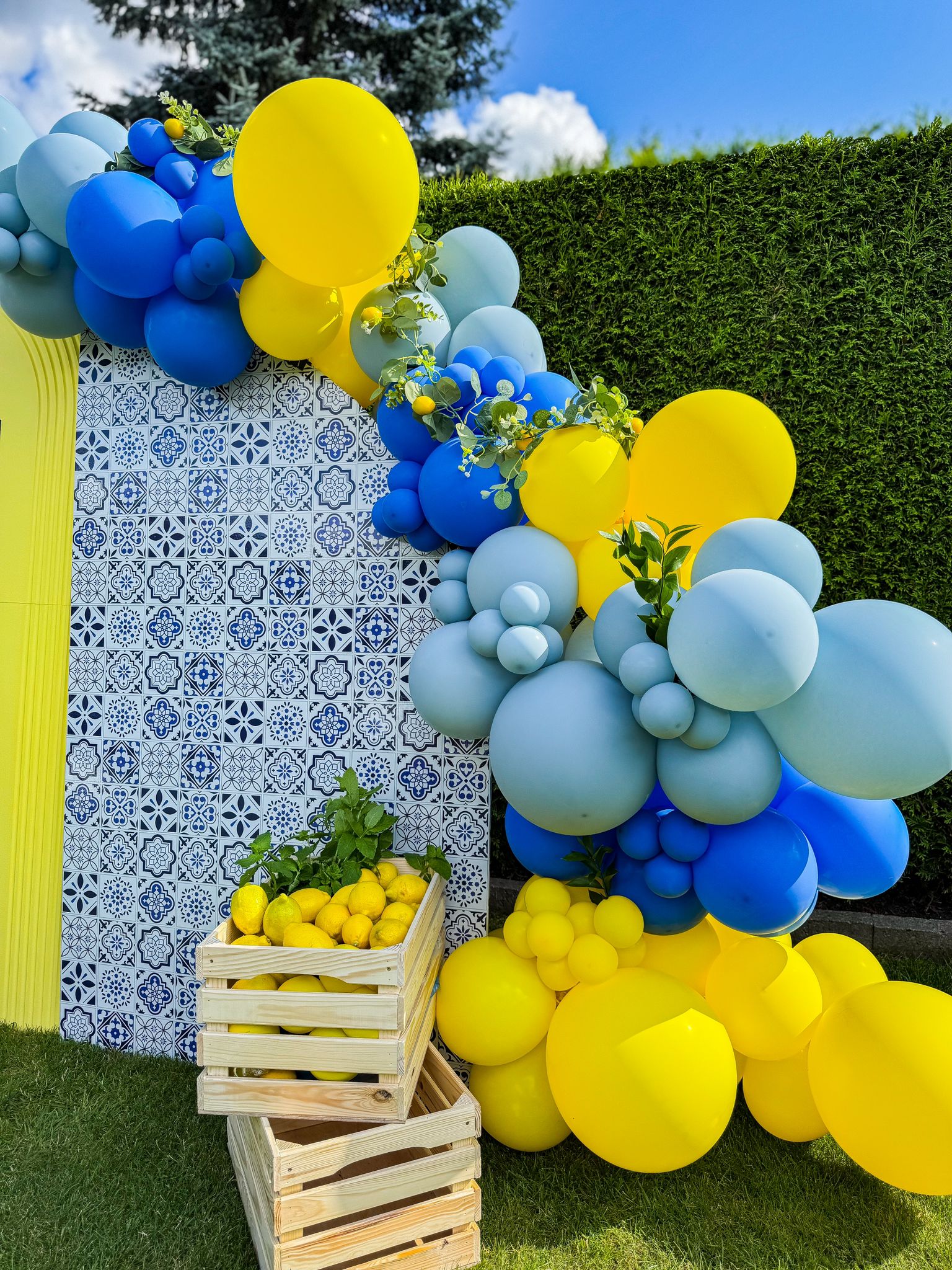 Cytrynkowy wieczór panieński w ogrodzie 🍋🌿 – świeża, letnia dekoracja w żółto-niebieskich barwach, z drewnianymi skrzynkami wypełnionymi cytrynami.