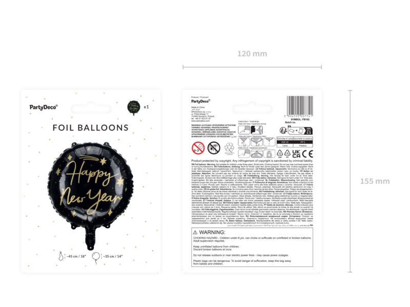 Balon foliowy „Happy New Year” w kolorze czarnym to stylowa i elegancka dekoracja na Sylwestra lub inne noworoczne przyjęcia. Jego średnica wynosi 45 cm, co sprawia, że idealnie sprawdzi się jako element głównej dekoracji lub dodatek do większego zestawu balonów. Złoty napis „Happy New Year” na tle czarnego balonu tworzy wyrafinowany kontrast, dodając imprezie wyjątkowego klimatu.